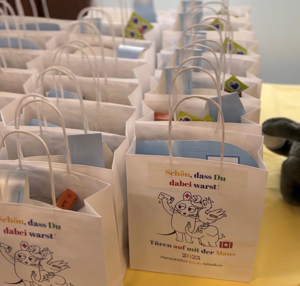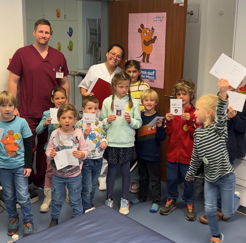 Leuchtende Augen und rote Nasen: am Feiertag des 3. Oktober blühten einige Seelen in der Kinderklinik auf. Unter dem Motto „Türen auf mit der Maus“ des WDR durften mehr als 20 Kinder zum ersten Mal offiziell hinter die Kulissen des Darmstädter Kinderkrankenhauses schauen. Mit viel Liebe und Professionalität stellte das Team die Abläufe in der Notaufnahme vor. Jede:r Teilnehmer:in wurde gründlich untersucht – den eigenen Gesundheitspass zum Mitnehmen gab’s mit persönlichem Foto.